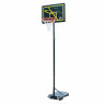Детская мобильная стойка для игры в баскетбол с щитом из полиэтилена. Для установки в помещении и на улице. В основание размером 75 х 45 х 13 см необходимо залить воду или засыпать песок объёмом 0,043 м 3  (43 литра). Телескопическая регулировка высоты от 165 до 210 см (по кольцу). Диаметр стойки (трубы, на которую крепятся щит и основание) - 4,5 см. Баскетбольное кольцо 38 см, цвет оранжевый. Всепогодная нейлоновая сетка в комплекте